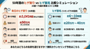 さらに、カミソリで肌を傷つけ、そのケアに費やすスキンケア代や皮膚科代を含めれば、その差はさらに広がります。